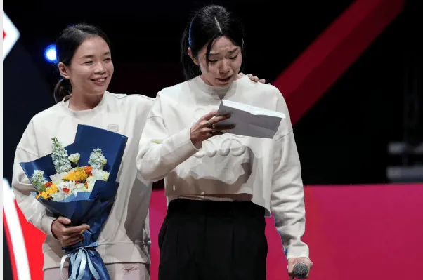 闭上眼睛,好多画面像旧电影一样闪过。是2014年世青赛,两个懵懂的女孩意外捧杯,当时只觉得快乐好简单。2016年我们开始正式步入成人赛,年底的法国公开赛夺冠好像就是把我们紧紧锁在一起了一样,没有退路的搭档身份就此开始了,2017年格拉斯哥,我们第一次登上世锦赛最高领奖台,拥抱时感觉到彼此剧烈的心跳,原来梦想成线年我们世锦赛没有进入前四,回来只有十天调整的时间,那段时间我确实也经历了一些之前没有遇到过的情况,一时把自己的精神状态拉到了低谷,伤病也在加重,当时我无法完成一堂完整的训练课,还记得你跟潘导说:“阿贾打不了,我也不打了!”你总是那么仗义,那么的护犊子。让我知道你永远为我撑腰!亚运会我们在团体赛上失利,输球。一时间,质疑声铺天盖地般地向我们袭来,我感受到了前所未有的煎熬,但我们也在最短的时间内,把身体状态和心理状态调整到了最佳,把自己逼的没有退路可言,最后拿到了亚运会单项的冠军。还有东京,那份意难平的银牌,让我们抱头痛哭,却也把我们的筋骨锻打得更加坚硬。2024年巴黎夺冠,我们目标清晰,结果在意料之中也在意料之外,不过结局是好的,过程怎么艰难都认了!