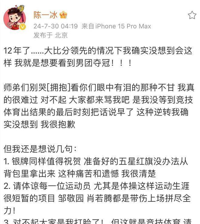 梦想破灭的那一刻才产生遗憾北京时间7月30日晚,当最后一名日本选手谷川翔稳稳地站在单杠上时,中国队全体队员神情凝重。当巴黎梦想破灭的那一刻,每个人的脸上都写满了深深的悔恨。日本队以259.594分获得冠军,中国队以259.062分获得亚军,美国队以257.793分获得铜牌。苏伟德在混合区:表示‘这不是一个很完美的结局。大家都尽力了,遗憾的是最后一根单杠。我的错误很严重。其实第一轮过后,我心里已经知道没有希望了,但我还是要做好自己的事情。主教练王义夫也感慨道,“整场比赛进行得比较顺利,但最后出现了一点问题。”作为主教练,我也有责任。我可能在训练时对单杠的关注不够。 网友热议争议不断赛后,陈一冰过早的庆祝言论引发网友批评。 “中场休息时开了两次香槟,感觉有点不合适。 , 抱着侥幸心理看比赛,其实是对运动员的不尊重。面对质疑,陈一冰于凌晨4点左右发文道歉。我真的很难过,对不起,请过来骂我。没有等到竞技体育成绩出来的最后一刻,说话还为时过早。我真的没想到会有这样的反转,抱歉。我准备的五星红旗,从背包里拿不出来。我理解其中的痛苦和遗憾。请体谅每一位运动员。虽然被打了脸,但这就是竞技体育。请允许一切发生。